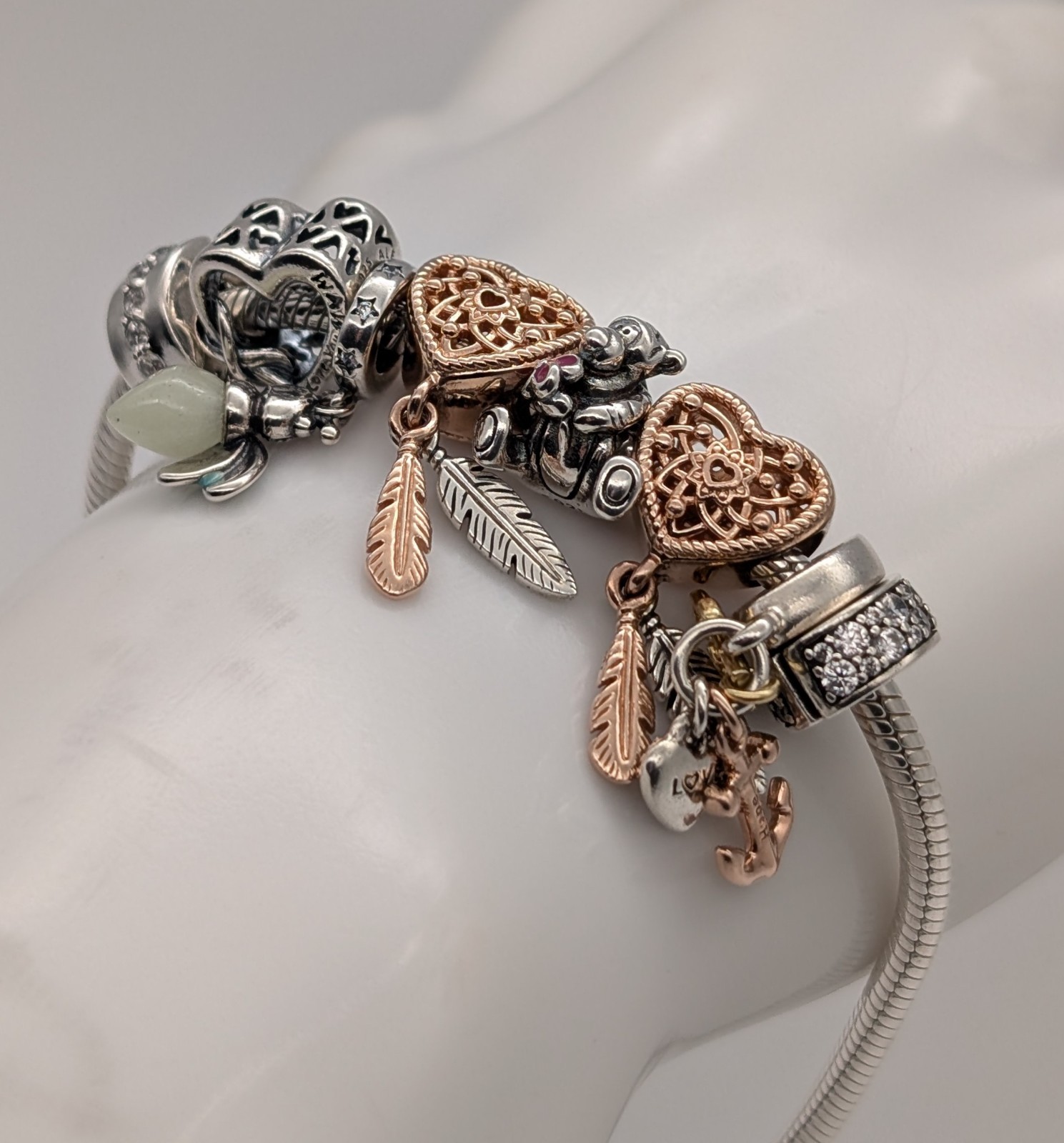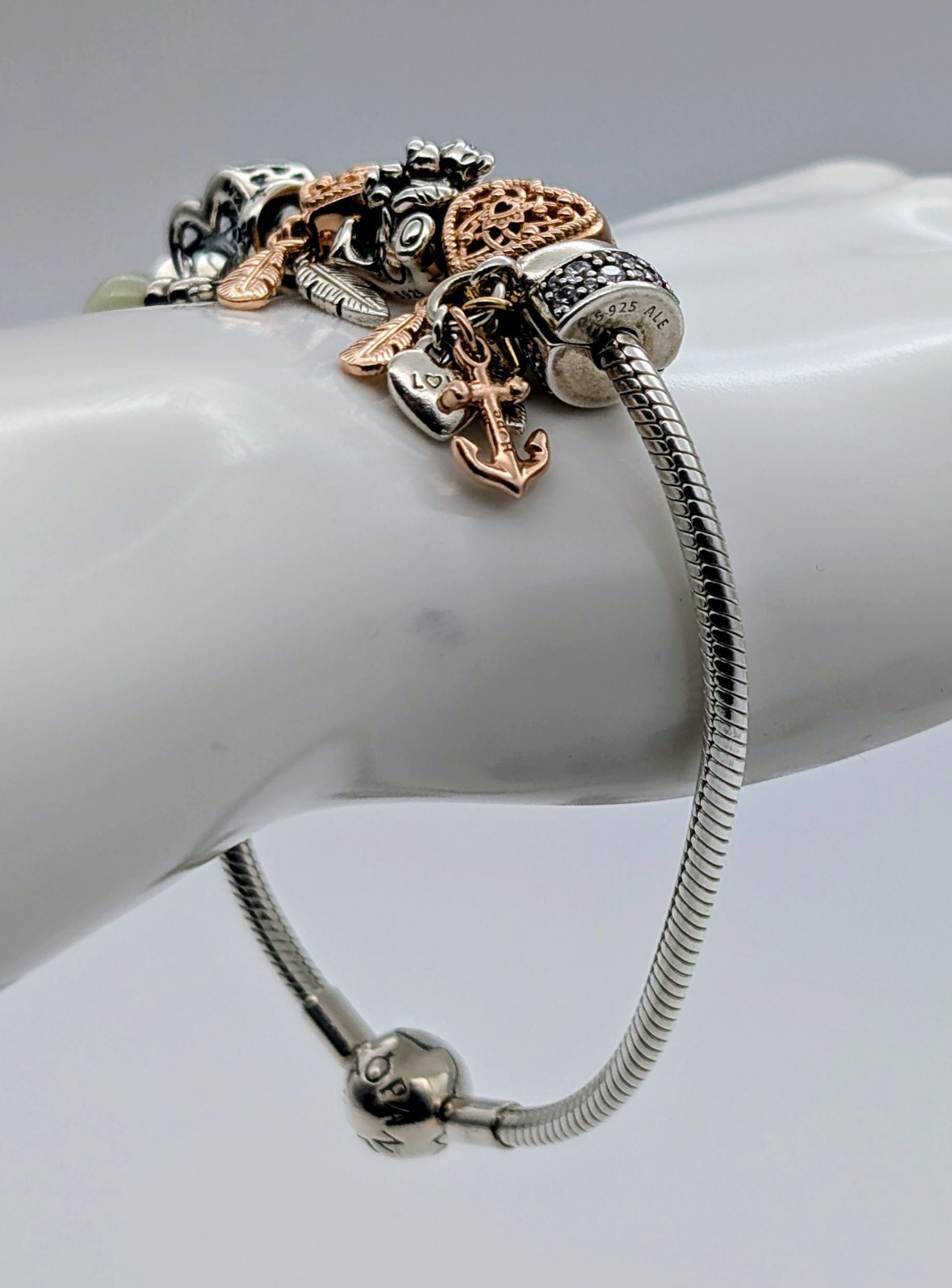 Dieses hochwertige Pandora Bettelarmband präsentiert sich als ausdrucksstarkes Komplett-Set mit insgesamt 8 stilvollen Charms. Die Kombination aus klassischem 925 Sterling Silber und eleganten Roségold-Akzenten verleiht dem Schmuckstück eine besonders edle und zugleich verspielte Ausstrahlung. Die detailreichen Anhänger – darunter filigrane Herzmotive, Federn sowie liebevolle Symbol-Charms – erzählen eine individuelle Geschichte und machen jedes Tragen zu etwas Besonderem. Dank des ikonischen Schlangenketten-Designs liegt das Armband angenehm am Handgelenk und bietet gleichzeitig sicheren Halt für die Charms. Ein perfektes Schmuckstück für Sammlerinnen oder als stilvolles Geschenk mit emotionalem Wert.