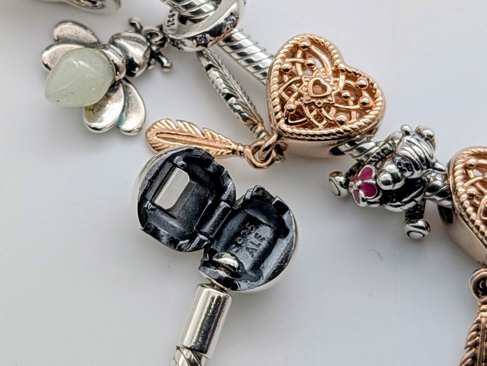 💎 Design: Schlangenarmband mit Herzverschluss & 8 dekorativen Charms (Herzen, Federn, Bär, Love-Anhänger u.a.)